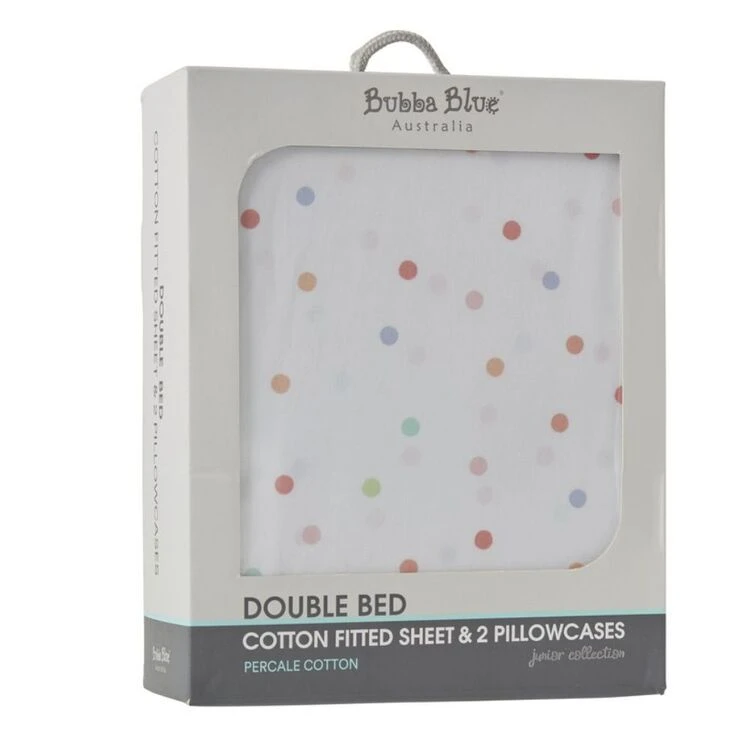 Bright, comfy, and suitable for year-round use, the Bubba Blue Rainbow Dreams 225 Thread Count Cotton Combo Sheet Sets a perfect addition to any bedroom! Made from a soft and naturally breathable cotton percale and featuring a gorgeous pastel confetti design, this lovely fitted sheet and matching pillow cases will ensure deep and restful sleep every night. This set co-ordinates perfectly with the Rainbow Dreams Quilt Cover set. Add character and comfort to your bedroom interior with the Bubba Blue junior collection available at Harris Scarfe today.