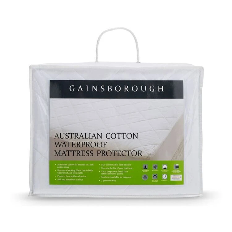 Sleep care free with the Gainsborough Australian Cotton Waterproof Mattress Protector. The Australian cotton fill and cover will ensure a cool, breathable and soft sleeping environment that creates immense comfort. A waterproof backing feature has been added to the protector to protect your mattress from any spills or accidents. It is machine washable for cleaning convenience and has a deep 40 cm fitted skirt which is designed to fit most mattresses.