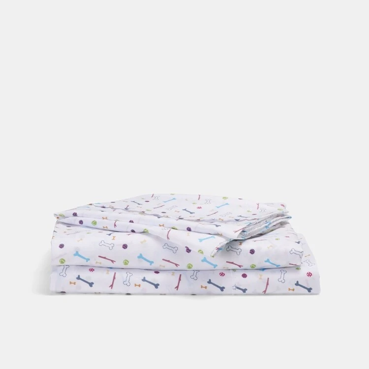 Enjoy the playfulness of bedding with the Happy Kids Bones Print Microfibre Sheet Set! This set is great for kids who love to play with their canine buddies. It features a printed pattern of colourful bones, sticks and tennis balls graphics – all of which dogs love to play with. These sheets are made of microfibre which will provide a smooth sleeping experience while being low maintenance. Explore the Happy Kid range for more fantastic bedding options, available at Harris Scarfe today.