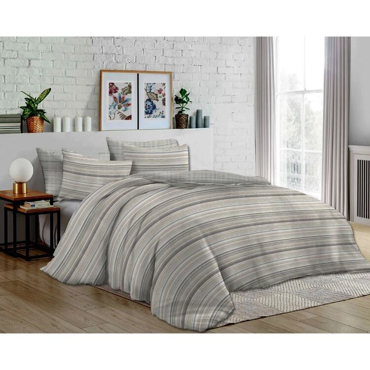 Enhance your bedroom aesthetic with the beige and grey variegated stripe patterning that the Polo Arden 250 Thread Count Cotton Quilt Cover Set has to offer. With a reverse that features a subdued irregular grey gingham design, you can flip your set based on your preferred style and to match any bedroom theme. Composed of 100% cotton, this quilt cover set is breathable, soft on the skin and suitable for all seasons.