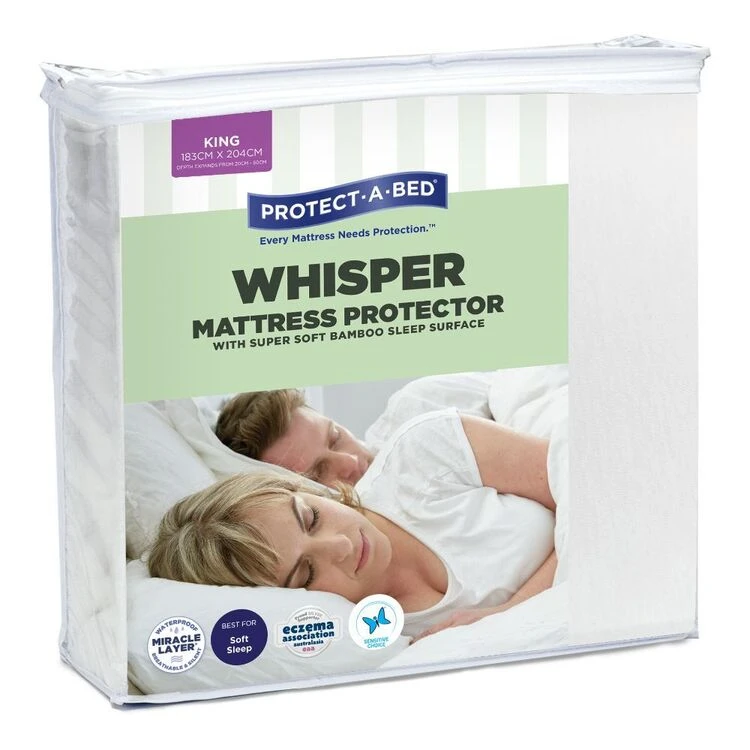 The Protect-A-Bed Whisper Bamboo Waterproof Mattress Protector has a super soft, nature-derived surface, that is easy to care for and can be machine washed and tumble dried. With unique Multishield™ properties, protect your mattress from spills and stains and your family from dust mites, mould and bacteria allergens.